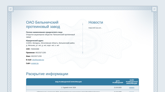 | AI-анализ | The website is for Belarusian company "Белыничский протеиновый завод ОАО" (Belarusian Protein Factory OJSC), located in the village of Melnik, Belarus. The website provides access to the company's annual reports and auditor's conclusions from 2017 to 2024. These reports and conclusions are available for download in PDF format. The website also includes a link to register and log into a personal cabinet using an email address and password. |