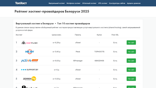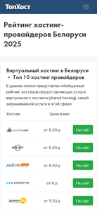 | AI-анализ | The web project tophost.by is a rating and information platform for Belarusian hosting providers. It lists and compares the features, pricing, and possibilities of the top 10 hosting providers in Belarus for 2025. The website focuses on virtual hosting, which is the most popular service in this sector. The table provides the minimum monthly costs, the availability of popular control panels like cPanel and ISPmanager, and the number of sites that can be hosted. The ranking takes into account the number of sites on a hosting, the cost of services, customer reviews, and other factors. When choosing a hosting provider in Belarus, it is essential to be cautious as a non-functioning website may result in losses, users not finding necessary information, or moving to competitors. However, if one is not economizing and purchasing from established and popular companies, such issues should not arise. Fact |