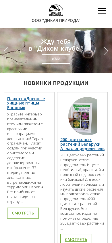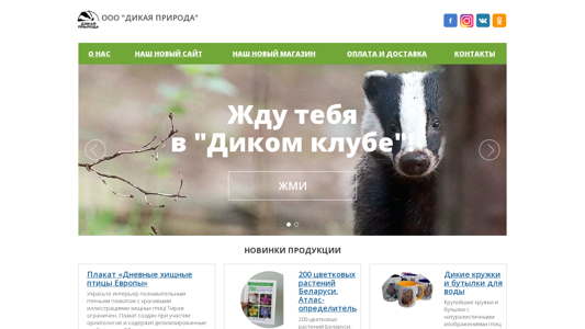 | AI-анализ | This website belongs to OOO "Дикая природа" (Wild Nature) and offers a new site and a new shop. The title includes the corporation's name and the phrase "наш новый сайт" (our new site). The description mentions the corporation's name, the new site, and the shop, as well as the means of payment and delivery, and contacts. The website also promotes a corporate retreat and invites visitors to join "Дикий клуб" (Wild Club). The main content includes a poster of European daytime raptors, an atlas-guide of 200 flowering plants in Belarus, and wild mugs and bottles with bird illustrations. All proceeds from the poster and sales of the atlas-guide go towards nature conservation in Belarus. The website also features a blog about the secret |