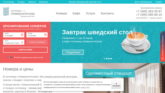 | AI-анализ | The portal is a website for University Hotel, an affordable hotel located in the southwest of Moscow near the Lomonosovsky Prospekt metro station. The website offers booking of economically priced hotel rooms, and includes information on nearby cafes, services, and contacts, as well as a section for vacancies. The site also features information on conference halls, maps and guides to Moscow, and detailed information on room types and prices. The hotel offers a range of room categories including economy, standard, semi-luxury, and luxury, and is located near several major Moscow attractions and transportation hubs. The website includes sections for booking rooms, cafe offerings, services, and contacts, as well as a visa support service and information on breakfast options. The site is named "University Hotel" and can be found at uhtl.ru. |
