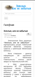 | AI-анализ | This website, titled "Галоўная" (Main), is the homepage of the electronic database "Зніклыя, але не забытыя" (Forgotten but Not Forgotten) created by the Homiel Oblast Public Library in collaboration with other public libraries in Homiel Oblast. Its purpose is to provide information about inhabited places and libraries in Homiel Oblast that ceased to exist due to the aftermath of the Chernobyl Nuclear Power Plant disaster. The database includes information about 270 abandoned settlements and 8 rural libraries. Data provided includes the name and location of the settlement, historical background, social and cultural development prior to the disaster, natural and historical monuments, notable personalities, and libraries (opening and closing dates, book fund, number of readers). |