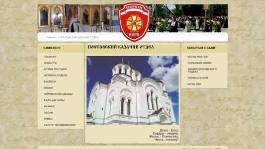 | AI-анализ | This website, titled "ПОСТАВСКИЙ КАЗАЧИЙ ОТДЕЛ »" (Postavsky Kazachiy Otdel), is primarily focused on the Postavsky Cossack Detachment. The description includes the phrases "Душу - Богу Сердце - Людям Жизнь - Отечеству честь - Никому!" (Soul - God, Heart - people, Life - Fatherland, Honor - nobody!). The keywords consist of words related to honor, people, life, and fatherland, as well as "Никому" (nobody) and "Отечеству" (Fatherland). The top_words suggest that the words "поставский" (Postavsky), "казачий" (Cossack), "отдел" (Detachment), and "устав" |