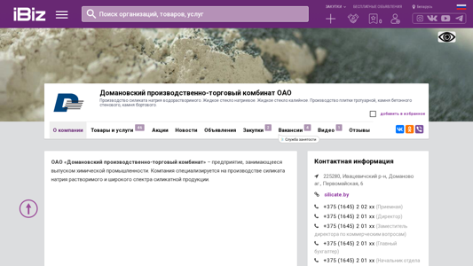 | AI-анализ | --- This online resource is dedicated to Domanovsky Production and Trade Combine OAO, which specializes in the production of sodium silicate, a type of chemical used in various industries. The key product of the company is sodium silicate in a water-soluble form, which is primarily exported to Russia. The company also produces a wide range of silicate products, including sodium silicate in a powdered form (dry water glass), potassium silicate in a powdered form (dry potassium water glass), liquid sodium silicate, liquid potassium silicate, sodium metasilicate, sodium metasilicate powder, water-dispersible acrylate-silicate paint, concrete products, reinforced concrete blocks, decorative stone blocks, and trotuar paving stones. |