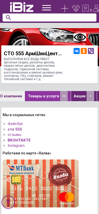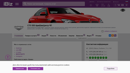 AI-анализ | --- This website belongs to СТО 555 АрмШинЦентр ЧП, a car repair and service company located in Minsk, Belarus. The company offers a wide range of services including argon welding, disc grinding, disc repair, suspension diagnostics, brake system repair, wheel bearing repair, starter motor repair, fuel system repair, and more. The address and contact information are provided. |