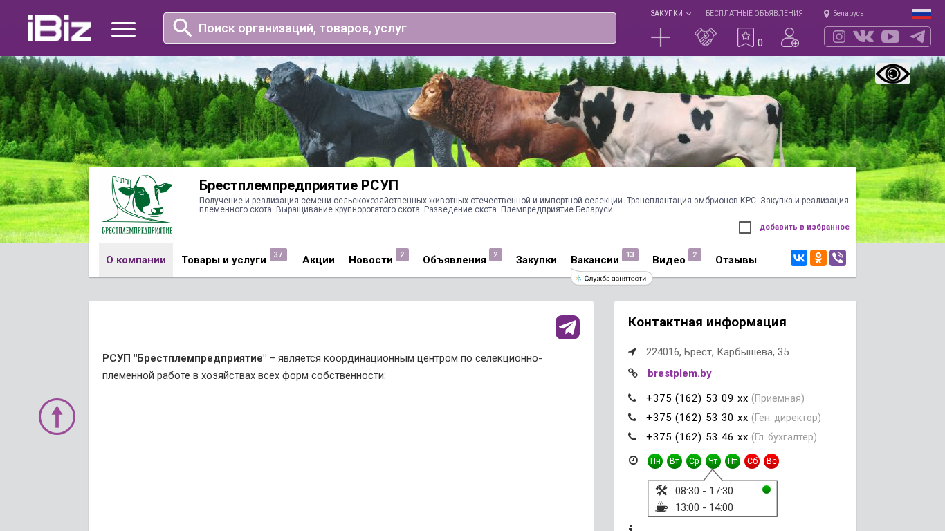 | Название / Заголовок | Брестплемпредприятие РСУП - Получение и реализация семени сельскохозяйственных животных отечественной и импортной селекции. Трансплантация эмбрионов КРС. Закупка и реализация племенного скота. Выращивание крупнорогатого скота. Разведение скота. Племпредприятие Беларуси.. 224016, Брест, , Карбышева, 35 |