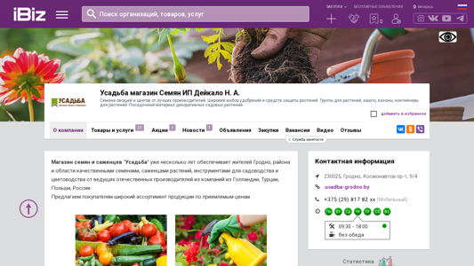 | AI-анализ | language: en-US This online resource is a seed and gardening supplies shop named "Усадьба магазин Семян ИП Дейкало Н. А." located in Grodno, Belarus at Космонавтов пр-т, 9/4. The store offers a wide range of vegetable and flower seeds from top producers, as well as fertilizers, plant protection products, gardening soil, pots, vases, containers, and decorative landscaping materials. |