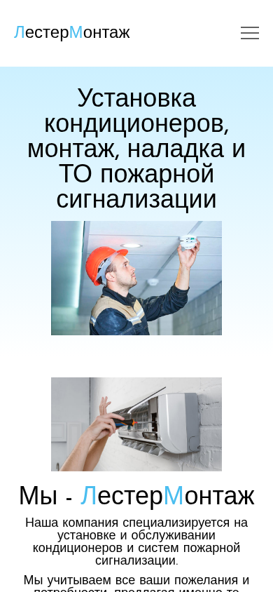 | AI-анализ | This online resource is named "Lester Montage" and is the website of a company specializing in the installation, servicing and maintenance of air conditioning systems and fire alarm systems. The website emphasizes on personalized solutions tailored to the customer's needs and preferences, using only reputable brands and ensuring high-quality installations and services. The company's team consists of qualified professionals with a higher education degree and a minimum of 3 years of practical experience. They cover the entire Minsk region and are present in each regional center and the capital city. The company continuously strives for innovation while maintaining established standards. There are links to their social media networks provided on the website. |