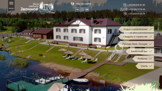 | AI-анализ | The web project "Zvannoe" is a recreational base and tourist complex in Vitebsk, Belarus, offering active leisure. It features a large well-maintained territory, modern and comfortable rooms, a closed gazebo, barbecue area, sauna, and fishing opportunities. Visitors can make a reservation online and fill out a form with their name, contact phone number, and email address. The base also offers a reverse call option, as well as contact information for the base manager, chief engineer, and lawyer. Social media links are provided, and the base is located near Vkontakte, Instagram, and Youtube. The complex includes a two-story guest house with seven two-person, one three-person, and two four-person rooms, a billiard hall, and banquet hall. Two one-story guest houses offer two two-person rooms |