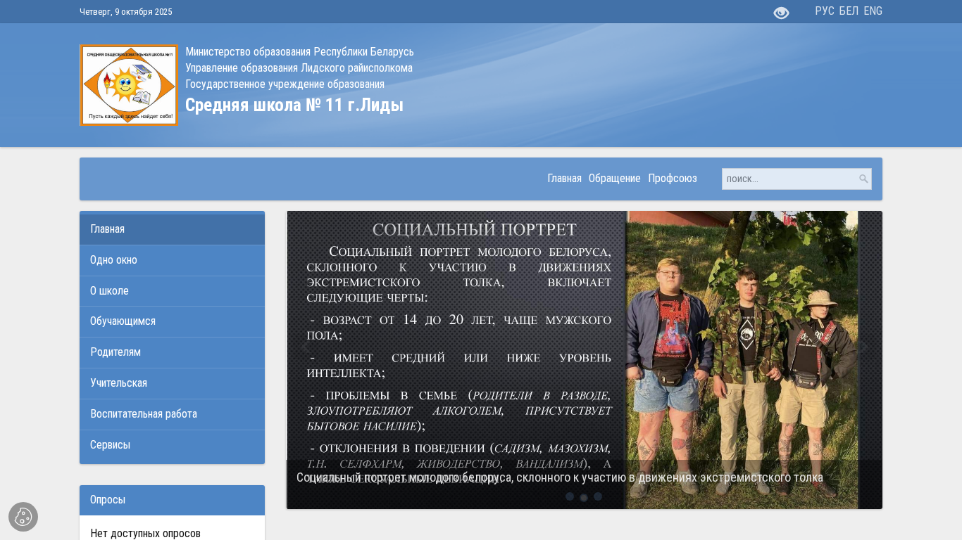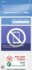 | AI-анализ | The portal <Средняя школа № 11 г.Лиды> is a Belarusian educational website for Middle School No. 11 in the city of Lida. The title and description indicate that it is operated by the Education Department of the Lida Regional Executive Committee and falls under the Ministry of Education of Belarus. The website provides information on school news, rules for students, and various educational events. In the 2025/2026 academic year, students are required to adhere to dress codes and rules regarding the use of mobile phones in school. The website also contains information on local and regional events, as well as national campaigns such as "Year of Improvement" and "Safety for Youth." Additionally, the portal features a virtual museum for applicants, information on the "Active Citizen School Day," and news about the State Symbolism. The website includes |