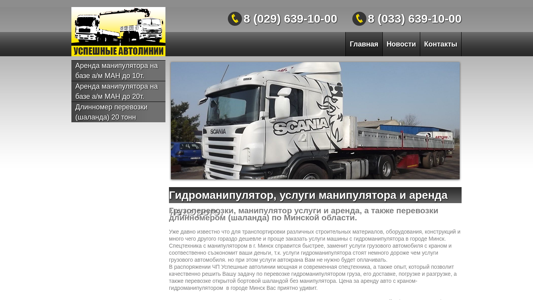 | AI-анализ | This online resource provides information on affordable rental services and usage of a manipulator, a hydraulic manipulator, and a dlinnomer (long arm) in the city of Minsk, Belarus. The website offers services for the transportation of various construction materials, equipment, and structures using a hydraulic manipulator, which is often more cost-effective and convenient than renting a crane-equipped truck and paying for crane services separately. The company, Successful Auto Line, has a powerful and modern fleet of specialized equipment and experienced personnel to handle the transportation, loading, and unloading of cargo with a hydraulic manipulator and an open-bed long arm. The rental prices for the auto with a crane-hydraulic manipulator in Minsk are surprisingly affordable. The services cover the Minsk region and the Republic of Belarus, offering rental and |
