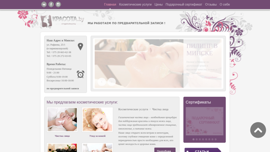 | SEO-описание | Косметология в салоне красоты: чистка лица, пилинг, лифтинг, мезотерапия! ☎ +375 29 663-62-38 |