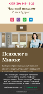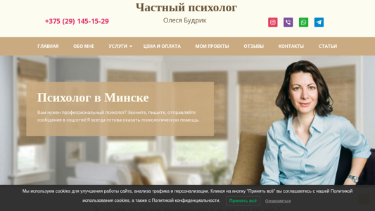 | AI-анализ | The portal olesyabudrik.by is a private psychologist practice website in Minsk, Belarus, operated by Olesya Budrik. The website offers professional psychological assistance for clients from Belarus and the CIS region. All services are paid and anonymous. The main page includes information about the psychologist, her services, and contact details for various communication channels such as Instagram, Viber, WhatsApp, and Telegram. The services provided include individual consultation, work with self-esteem, relationship issues, depression, change, separation, and group work. The website also offers online supervision. The homepage also features links to the psychologist's projects, testimonials, and articles. The website's title and description mention the psychologist's name, location, and the type of service offered. Keywords include words related to the psychologist, her services, and related mental health |