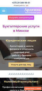 | AI-анализ | The portal Ardenna.by offers accounting services in Minsk, with outsourcing of accounting services under contract. The website provides services for both legal entities and physical persons, offering consulting services on taxes and finances in understandable language. It also offers assistance with tax declarations for individuals, as well as explanations of revenue sources and consultation on professional tax, self-employed individuals without registration, and objections to tax audits. Additionally, it offers tax consulting services for both legal entities and individuals, as well as instructions for registering an OOO, and the choice of tax reporting systems. The landing page features information on accounting services and outsourcing of accounting services. Services for legal entities include accounting, bookkeeping using the USN method, tax accounting, personnel accounting, statistical reporting, accounting policy, and pricing for legal entities. Services for individuals include tax consulting, zero reporting, and instructions for registering an OOO |
