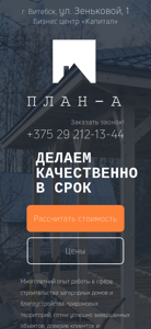 | AI-анализ | This online resource is a construction company website named "План-А" based in the city of Vitsebsk, Belarus. The company offers a range of services related to construction, repair, and renovation of various structures including country houses, apartments, saunas, and the landscaping of surrounding areas. Keywords associated with the site include 'works', 'jobs', 'Vitsebsk', 'plan-a', 'construction', 'quality', 'houses', 'materials', and 'services'. The site features a phone number for contact and a promise of high-quality work completed on time. The company has a long history of successful projects and client satisfaction. Services include construction and repair of homes, cottages, saunas, relaxation areas, as well as landscaping. Repair services are also offered for residential and commercial spaces. Prices for construction and decorative work start at |
