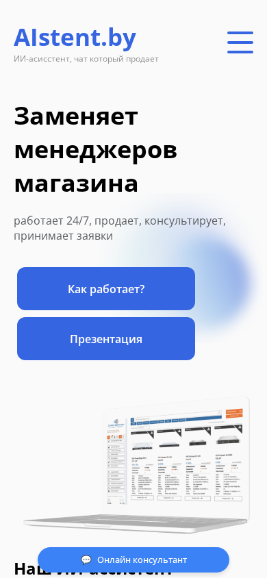 | SEO-описание | ИИ ассистент обеспечивает рост прибыли, экономит ресурсы интернет магазина, увеличивает средний чек, способен заменить менеджеров. |
