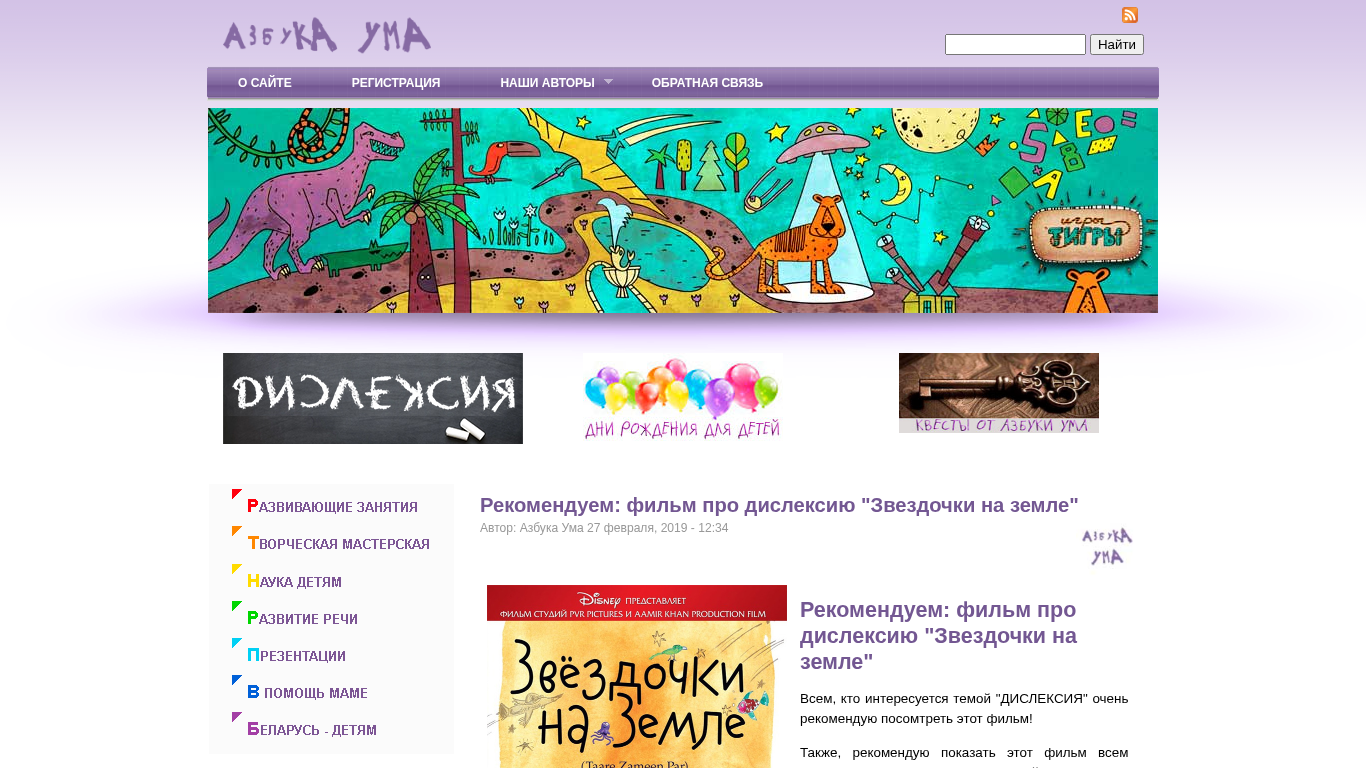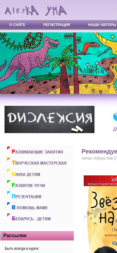 | AI-анализ | This online resource is dedicated to the early development of children, games with children, and presentations for kindergarteners in Belarus. The title is "Азбука Ума," which translates to "Alphabet of the Mind" in English. The description includes mentions of a film about dyslexia, a lock, zodiac symbols, the earth, authors, registration, news, and recommendations. Keywords associated with the website include "azbuka," "ума," "film," "дислексия," "замок," "звездочки," "земле," "автор," "подробнее," "стриж," "голову," "беларусь," "детей," and "беларуси." The website also includes links to registration and newsletters. One of the recommended films is called "Звездочки на |