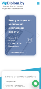 | AI-анализ | --- This online resource, Vipdiplom.by, offers diploma and thesis writing services in Minsk, Belarus. Clients can order custom diploma projects, including thesis and dissertations, with both online and offline consultation options. The company's team helps students and researchers complete their works with specified deadlines, and various forms of payment are accepted. The website provides samples and examples of diploma and thesis texts, as well as information on guarantees, discounts, and frequently asked questions. Services and prices include diploma work, control work, report writing, referat, and dissertation writing. Consultation fees vary depending on the project's scope and deadlines. The company also offers bonuses for repeat customers and language courses. |