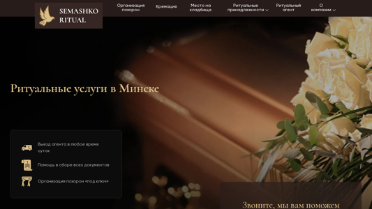 | AI-анализ | The portal semashko-ritual.by offers funeral services in Minsk at affordable prices. They provide all types of ritual services quickly and efficiently. Contact +375 (29) 616-06-87 for more information. The company has been offering ritual services for over 10 years. Although relatives can handle the organization of funerals themselves, it is often more convenient and less stressful to seek help from a ritual agency. The portal provides funeral services, including cremation, a plot on the cemetery, ritual items such as wreaths, ritual clothing, tablets on the cross, coffins, and crosses on the grave. The company operates legally, efficiently, and professionally. Services include transporting the body to the morgue, ordering ritual items and transport, arranging a funeral in a church, and organizing various tasks to preserve the body. |