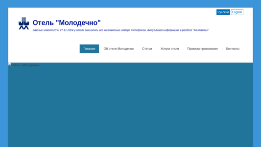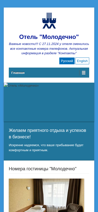 | Название / Заголовок | Отель "Молодечно" - Важные новости!!! С 27.11.2024 у отеля сменились все контактные номера телефонов. Актуальная информация в разделе "Контакты" |