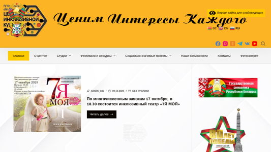 | AI-анализ | The portal "Государственное учреждение 'Гомельский областной центр инклюзивной культуры' (inkulture.by)" is a cultural institution in Belarus dedicated to promoting inclusive culture. The website features information on various studios, theatres, and projects related to this mission. These include a children's inclusive theatre, a clown and pantomime studio, a folk song theatre, an open-access studio for contemporary dance, and a studio for visual arts. Additionally, there are studios for vocal music, decorative-applied arts, cinematography, historical ballroom dance, acrobatics and fitness, robotics, and contemporary dance. The centre hosts several festivals and competitions, such as an open satire and humor festival, a regional signing song festival, a beauty and creativity contest for children, and an inclusive vocal festival |