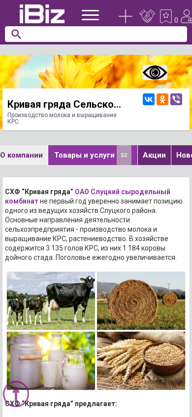 | AI-анализ | --- This online resource belongs to Kriвая gряда, a farming branch of OAO Slutskyy syrodelnyy kombinat, specializing in milk production and cattle breeding. The address is 223644, , Gatsuk ag., Administrative , 3. The website provides a map, contact numbers, and the company's address. The main activities of the farm include livestock farming, particularly milk production, and cattle breeding. The farm houses 3,135 heads of cattle, with 1,184 of them being dairy cows. The herd size continues to grow annually. Kriвая gryada offers milk, beef, cattle breeding stock, grain crops, legume crops, and animal feed. In 2020, a new dairy and livestock complex was commissioned, comprising a milking |