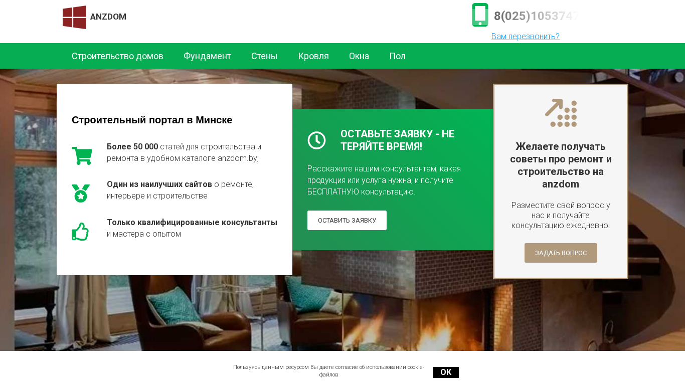 | AI-анализ | --- The website anzdom.by, titled "Мир стройки anzdom.by в Минске: окна, двери, ремонт, благоустройство - скидки, отзывы | Загородный дом," offers information and services related to construction, repairs, and home improvement in Minsk, Belarus, with a focus on windows, doors, and foundations. The site includes a calculator, sales promotions, and contact information for consulting and placing orders. It also features a large catalog of over 50,000 articles on various aspects of construction and repair, making it one of the leading online resources for these topics in the region. The site is staffed by qualified consultants and craftsmen with experience. Users can submit inquiries for free consultations and receive daily responses. The site covers various aspects of construction |