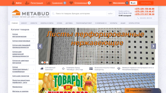 | AI-анализ | This website is an online store named Metabud, specializing in the sale of building and household items. The product range includes various types of fences, greenhouses, pest control, and protective materials for gardens. Customers can browse and purchase items such as metal and tulle fences, protective nets, and transporter nets through the catalog. The store offers a wide selection of transport nets with different types, including single and double ply, and various transport net models like gasketed rotating and spiral-wound. The catalog also features sieves for sifters, tulle sieves with fringes, and self-cleaning string sieves. The store provides a list of perforated sheets, spare parts for agricultural machinery, and various types of screws, nuts, and bolts for fastening purposes. The website operates from Monday to Friday, 8:30 |