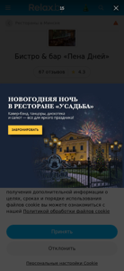 | AI-анализ | This online resource is a restaurant listing and review website, specifically focusing on the restaurant "Пена Дней" located in Minsk, Belarus, at the address Интернациональная 23. The website provides information on the restaurant's location, operating hours, phone numbers, and menu prices. The title of the page includes the phrase "отзывы, цены в меню, адреса и телефоны" (reviews, prices in menu, addresses and phone numbers), and the description mentions "телефоны, график работы и карта проезда" (phone numbers, working hours and map). The top words in the text indicate that the page contains information about the restaurant's location in Minsk, its name, menu, and phone numbers, as well as the words "отзывов" (reviews) and "цены" (pr |