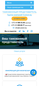 | AI-анализ | The web project custom.by is a customs broker or representative in Belarus with over 30 years of experience. The customs agency offers expertise and a solid reputation, unmatched in Belarus. Services include the registration of transportation for physical individuals, payment of utility taxes, customs clearance, statistical declaration, certification, and a branch in Grodno. The site features a form for inquiries and a menu with sections on the company, team, services, pricing, benefits, and contacts. |