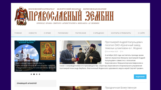 | AI-анализ | The portal is dedicated to the Orthodox Church of Saint Archangel Michael in Zembin. The website provides information about the church, its history, and current activities. It includes sections for news, articles, prayers, and a schedule of services. The site also features interviews, videos, and documents related to the church and its community. There is a section for social work, including a prayer room in a local hospital, and contacts for the church leadership and site information. The site includes a map of the location and a calendar of events. The church's rector, Protoierey Andrey Kapulcevich, visited the Kuznechny Zavod Tyezhlykh Stampovok factory in Zhodino on October 8, 2025, and participated in a festive liturgy for the feast day of Saint Sergius of Radonezh. |