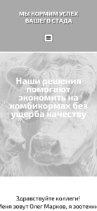 | AI-анализ | The portal feedlot.by is a website dedicated to providing solutions for farmers and agricultural companies specializing in large cattle (kрупное рогатое скот, KRS) farming. The website offers information on the services of Oleg Markov, a zootechnician with over 10 years of experience in the field of developing balanced feed recipes for KRS, aimed at improving their health and productivity. The site also emphasizes the economical benefits of these solutions, with a focus on savings on feed costs. The content highlights Oleg's expertise, individual approach to each farm's needs, and the creation of high-standard feed recipes. |