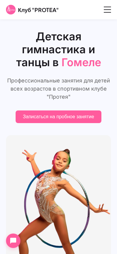 | SEO-описание | Спортивный клуб Протея в Гомеле - профессиональные занятия художественной гимнастикой и танцами для детей от 4 до 14 лет. ✓ Опытные тренеры ✓ Современное оборудование ✓ Удобное расписание ✓ Первое пробное занятие бесплатно! Запишитесь прямо сейчас! |