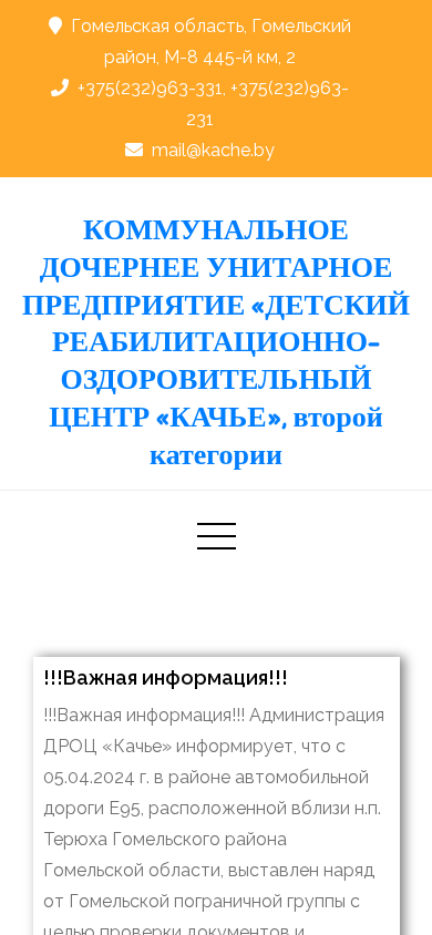 | AI-анализ | The web project is a second-category communal enterprise named "Detsky Reabilitatsionno-Ozdravitelnyy Centr 'Kache' (Child Rehabilitation and Health Centre 'Kache')". The website provides information on the organization, its location in the region of Homielskaya oblast, Homielskiy rayon, M-8 445-y km, and contact details, including phone numbers and email address. The main sections of the site include 'About us', 'Prices and services', 'Pedagogical staff', 'Useful information', 'Organization of educational process', 'Documentation', 'Union', 'Revision commission', 'Public commission for labor protection', 'Parents and children', 'Routine', 'Academic process', 'Excursion service', 'Psychologist page', 'Psychological circle', 'Important |