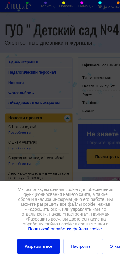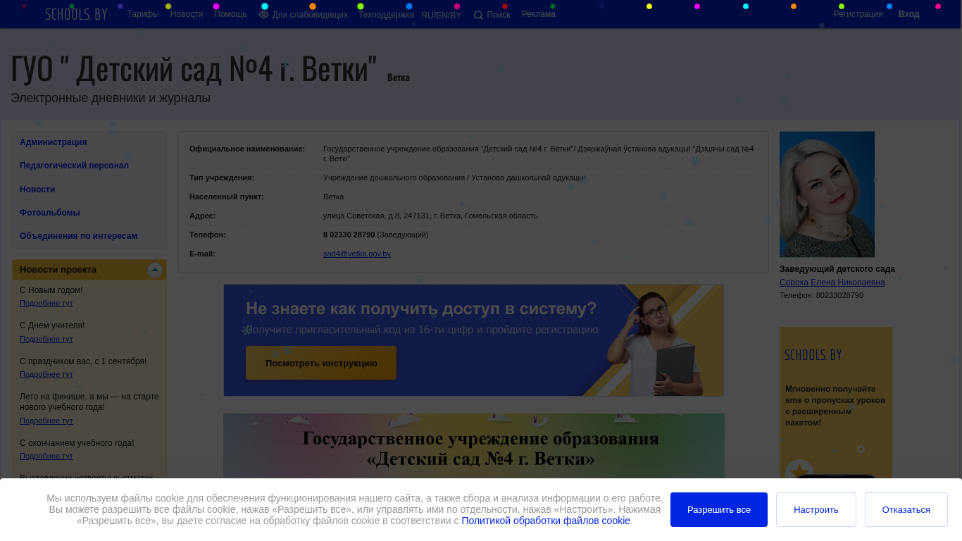 | AI-анализ | --- The web project "Детский сад №4 г. Ветки" (Sad4vetka.schools.by) is an educational website for a kindergarten in Vetka, Belarus. The site uses cookies for site functionality and data collection and analysis. Users can allow all cookies, manage them individually, or decline them entirely. A cookie policy is provided for review. The site's color scheme is black and white with text-based content and images disabled. |