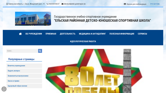 | AI-анализ | This online resource is the official website for "Ельская районная детско-юношеская спортивная школа" (El'sk Regional Children and Youth Sports School), located in the city of Elsk, Goemelskaya oblast, Belarus. The site provides information on the school's administration, trainers, structure, working hours, goals, catalog of services, photo album, contacts, and various sports events such as sports days, spartakiads, and sports activities for educational institutions, the rural population, and residents of the area. The school offers paid services like skating rink and sauna, as well as transportation services. The site also includes sections on health and safety, anti-doping, and various awareness campaigns such as World No Tobacco Day, World AIDS Day, and Day for Preventing Injuries. The site includes a calendar of state holidays |