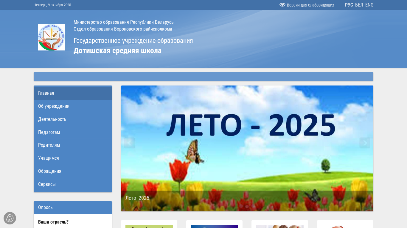 | AI-анализ | --- This website belongs to Dotyshskaya Srednya Shkola (Dotysh Secondary School) in Belarus. The title of the website is given in Belarusian language, which translates to English as 'Dotysh Secondary School'. The description section is empty. The top keywords for this website include the year '2025' with a frequency of 34, 'works' with 10 occurrences, and various school-related terms such as 'school', 'education', and 'organization'. Other keywords include 'October' with 9 occurrences, and 'news' with 6 occurrences. The domain name is dot.voronoo.gov.by. |