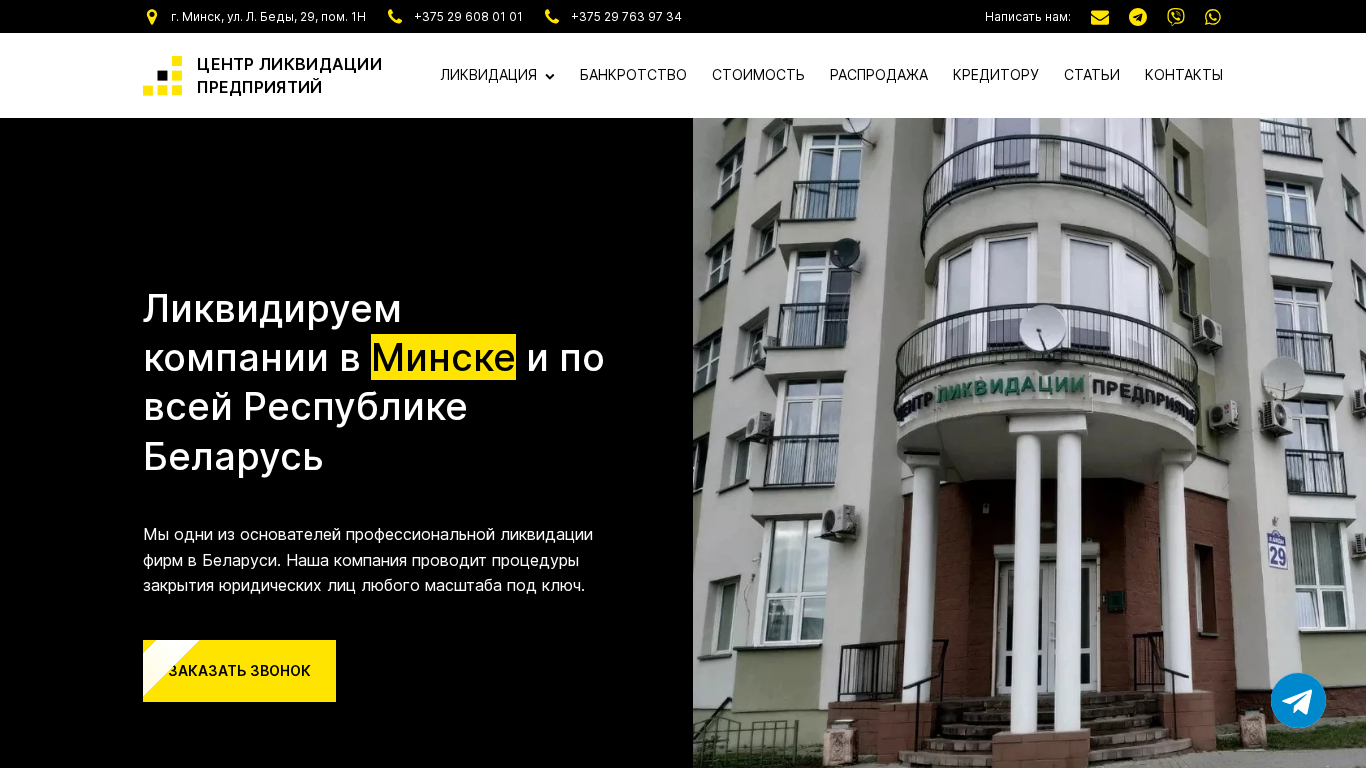 | SEO-описание | ЗАО "Центр ликвидации предприятий" — один из основателей профессионального закрытия юр лиц, ООО, ИП, ЧУП, ОДО в Минске и Беларуси. Работаем с 2009 г. Звоните +375-29-608-01-01 |