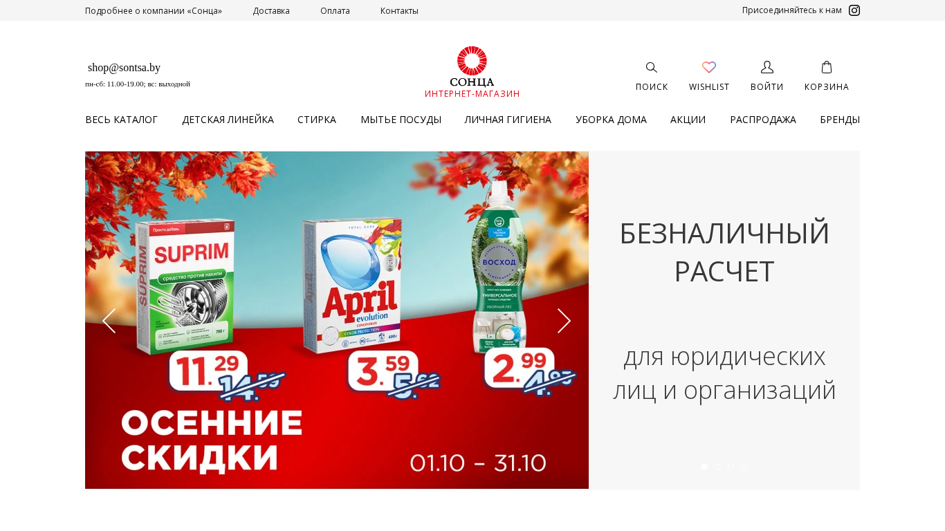 | SEO-описание | Компания Sontsa - производитель современных качественных средств для стирки, продуктов бытовой химии и личной гигиены. В нашем интернет-магазине вы можете выгодно купить стиральные порошки, гели и кондиционеры для белья, шампуни и бальзамы для волос, средства для мытья посуды и уборки дома. Белорусские бренды! Собственное производство. |