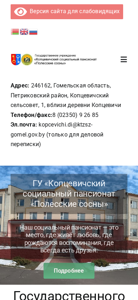 | AI-анализ | This website is for the State Institution "Kopcevich Social Boarding House 'Polessian Pines'" in Belarus. The title of the website is 'Главная' (Main) and it provides information about the institution, including its administration, normative documents, anti-corruption activities, ideological work, primary trade union organization, services, medical care, social rehabilitation and information on the rules for occupancy, visits and internal regulations for residents. The website also includes contacts for the institution, including a phone number and email address. The top keywords used on the website are 'граждан' (citizens), 'копцевичский' (Kopcevich), 'социальный' (social), 'пансионат' (boarding house), 'подробнее' (more details), 'полесские' (Polessian), 'со |