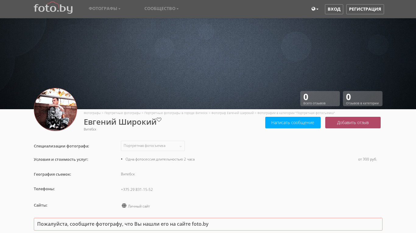 | AI-анализ | The portal is a photography website belonging to Evgeny Shiroky, a portrait photographer based in Vitsebsk, Belarus. The site features a catalog of photographers, with Evgeny's portfolio listed under the "Portrait Photography" category. Evgeny's photography services are available in Vitsebsk and he offers one photo session lasting two hours for a starting price of 300 rubles. The site includes a contact phone number and a link to his personal website. |
