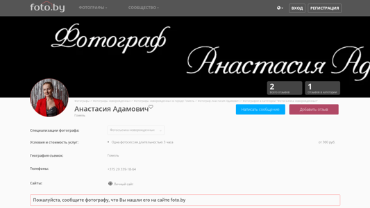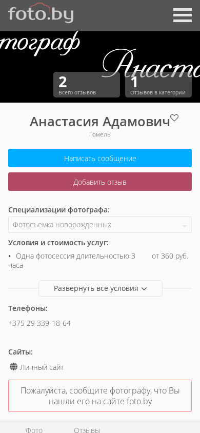 | AI-анализ | This online resource is dedicated to the photography portfolio of Anastasia Adamovich, a photographer based in Gomel, Belarus. The website primarily showcases her works in the "Newborn Photography" category, which is characterized by a minimalist style. Visitors to the site can explore other photography genres such as family, children, and various events. The platform provides access to reviews from previous clients, details on pricing and shooting conditions, and contact information. The main page displays the catalog of photographers, but it can be changed to show the community of photographers instead. The site is available in both Russian and Belarusian languages. It was last accessed on July 7, 2025. The photographer's specializations include newborn, family, and children photography. Pricing for a 3-hour photo session starts at 360 rubles, and the photographer covers shoot |
