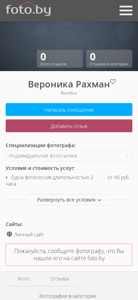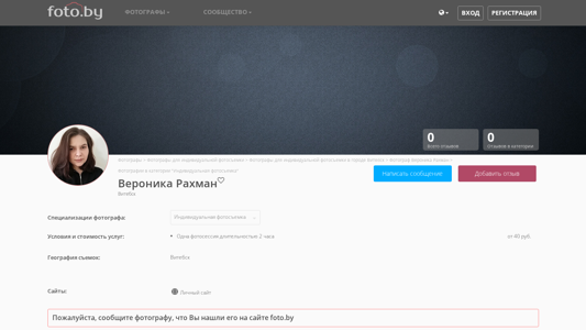 | AI-анализ | --- The portal is a photography website belonging to Veronica Rahman, based in Vitsebsk, Belarus. The site features photographs categorized under 'Individual Photo Shoot'. Veronica Rahman offers photography services for individual shoots in Vitsebsk. The website also includes a community of photographers, a blog, and statistics. The main page displays a catalog of photographers, and the 'Individual Photo Shoot' category showcases Veronica Rahman's work. Other categories on the site include 'Animals', 'Architecture', 'Birthday Sessions', 'Corporate Events', 'Weddings', 'Family Portraits', 'Food', and 'Love Stories', among others. Users can write messages, add reviews, and view photographer portfolios. The site is available in both Russian and Belarusian languages. |