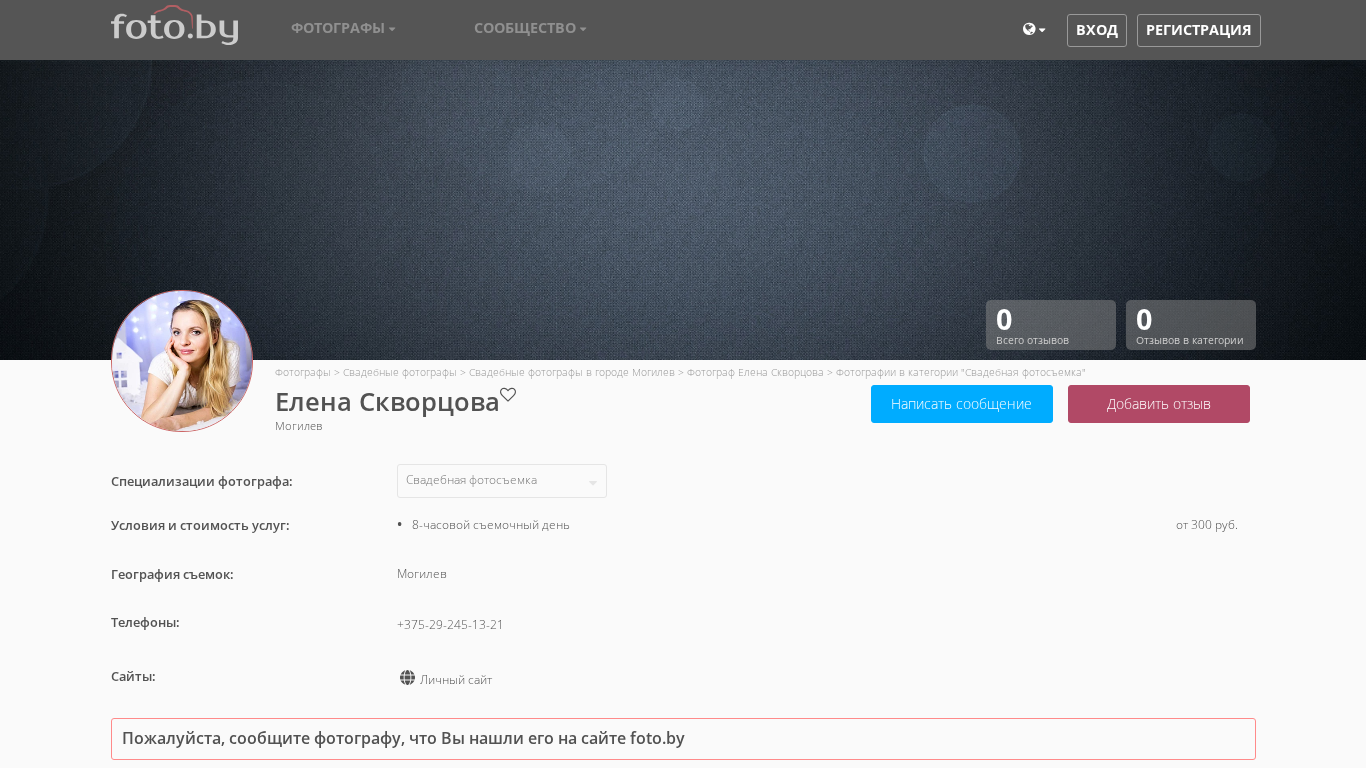 | SEO-описание | Фотографии в категории "Свадебная фотосъемка". Фотограф Елена Скворцова - выполняю следующие виды фотосъемок: детская фотосъемка, свадебная фотосъемка, фотосъемка беременных. Работаю в городах: Могилев |