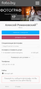 | AI-анализ | --- The web project "Photographer Alexey Romanyovsky, Minsk. Photographs in the "Wedding Photography" category" is a photography portfolio site for Alexey Romanyovsky, a wedding photographer based in Minsk, Belarus. He specializes in wedding photography and offers his services in various cities including Minsk, Brest, Gomel, Vitsebsk, Grodno, Mogilev, Baranovichy, Pinsk, and Bobruisk. The site includes a catalog of photographers, a community for photographers, and a blog. The main page displays a catalog of photographers by default. The site also features a section for user reviews, with 17 reviews in total for this photographer. The site is available in both Russian and Belarusian languages. The photographer's contact information, including a phone number and |