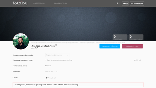 | AI-анализ | The website is a photography portfolio for Andrey Mavrin, a portrait photographer based in Mogilev, Belarus. The site showcases his work in the "Portrait photography" category. Visitors can also find information on his services, pricing, and contact details. The website is part of the foto.by domain, which is a community and marketplace for photographers. |
