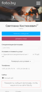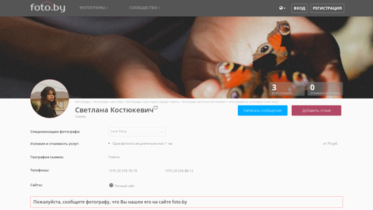 | AI-анализ | This website belongs to photographer Svetlana Kostyukevich based in Homel, Belarus. The site primarily features photographs in the "Love Story" category. The photographer identifies herself as a Love Story photographer and an individual photographer in Homel and Mozir. |