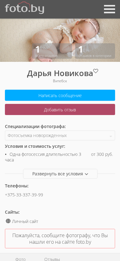 | AI-анализ | The web project is a photography site by Daria Novikova, based in Vitsebsk, Belarus. It features a category dedicated to newborn photography. The site is part of the larger community of photographers on Foto.by, and can be accessed under the 'Photographers' tab in the main catalog or by visiting Daria Novikova's personal page directly. The photographer offers her services as a newborn photographer in Vitsebsk, with pricing starting at 300 rubles for a three-hour session. The site includes a portfolio of her work, as well as contact information, including a phone number and personal website. Visitors can also leave reviews and read others' opinions of Daria's photography. The site is accessible at darya-novikova.foto.by. |