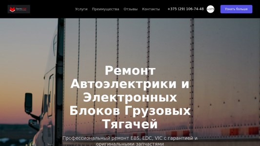 | AI-анализ | This online resource, titled "Ремонт Автоэлектрики Грузовых Тягачей - Electric Fox," offers professional repair services for the electronic systems of heavy-duty trucks. Keywords related to this website include "ремонт" (repair), "автоэлектрики" (autoelectrics), and "грузовых тягачей" (heavy-duty trucks). The website provides information on repairing EBS, EDC, and VIC systems, using original parts and offering a guarantee. Additionally, the site mentions diagnostic and repair services for wiring, starters, and generators, with prices starting from 150 BYN. Customers can choose between workshop repairs and on-site services, with contact information provided for inquiries. The website also has a presence on Telegram, WhatsApp, and VK |
