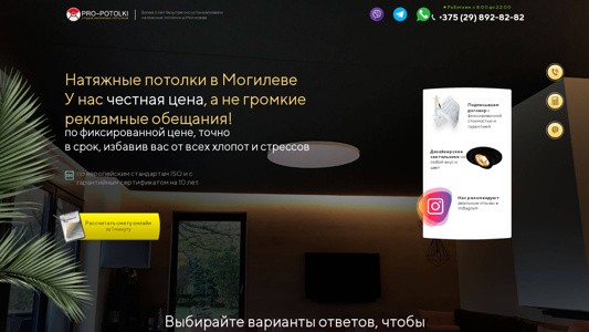 | AI-анализ | --- The portal "Pro-Poтоlki" offers installation of various types of suspended ceilings in Mogilev, Belarus. The company provides a fixed-price policy and guarantees work within European standards, with a 10-year warranty. The product range includes glossy, matte, satin, textile, photo-print, and other options. Customers can calculate the cost based on the room size and desired number of lighting points, with options for self-delivery and pick-up of materials. The company offers consultations in their office or by phone. The website also features testimonials on Instagram. |