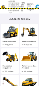 | AI-анализ | This website is for renting special equipment in Belarus. Users can place orders online. The website offers a large selection of special equipment and attachments. Over 700 units of equipment are available. The company operates throughout the country. Keywords related to the website include 'rub', 'час', 'цена', 'запросу', 'аренда', 'спецтехники', 'беларуси', 'заказать', 'онлайн', 'навесного', 'оборудования', 'работаем', 'всей', and 'стране'. The top words on the website are 'руб', 'час', 'цена', and 'запросу'. Equipment for rent includes a mini-excavator for 75 rub/hour, a mini-loader for 80 rub/hour, an excavator-loader for |